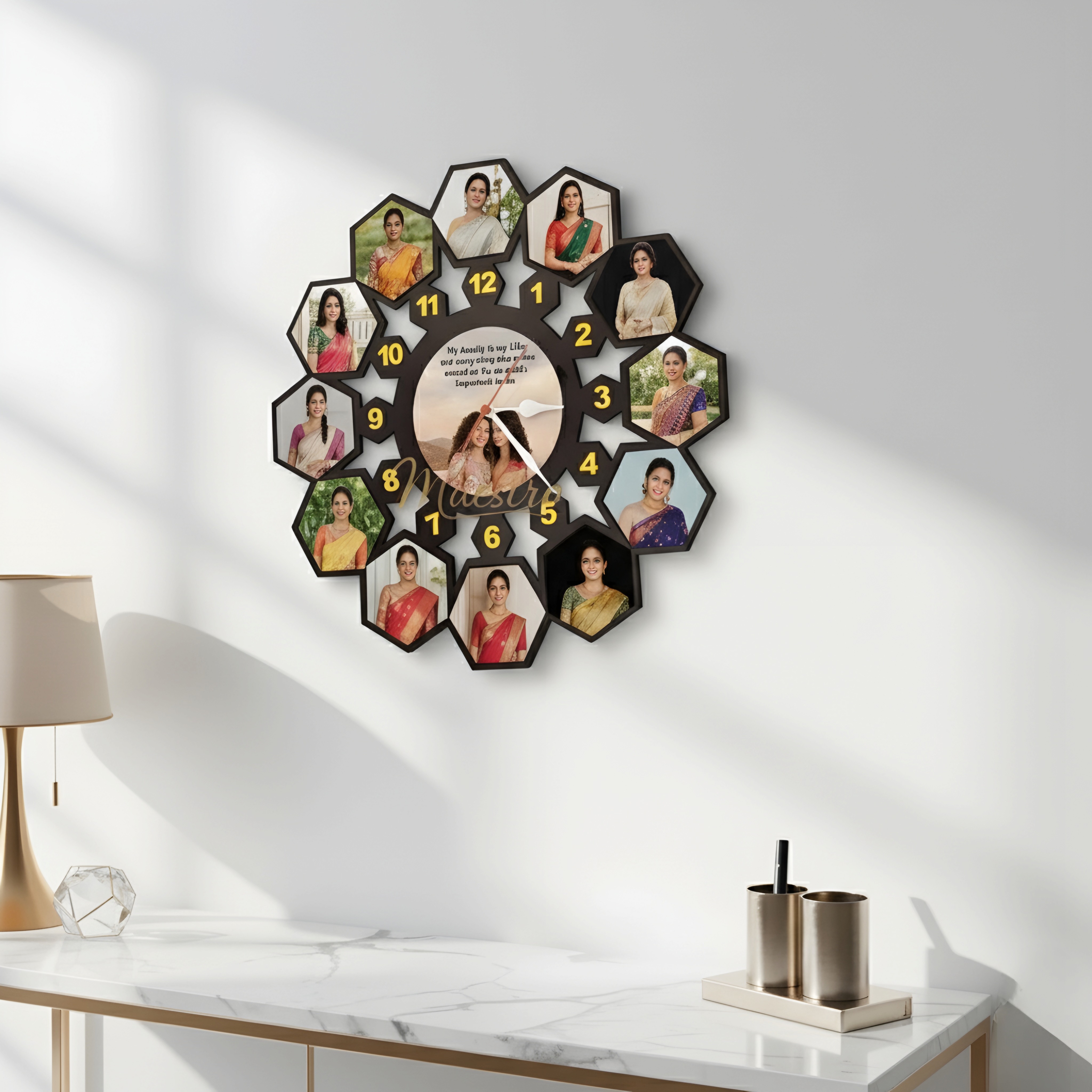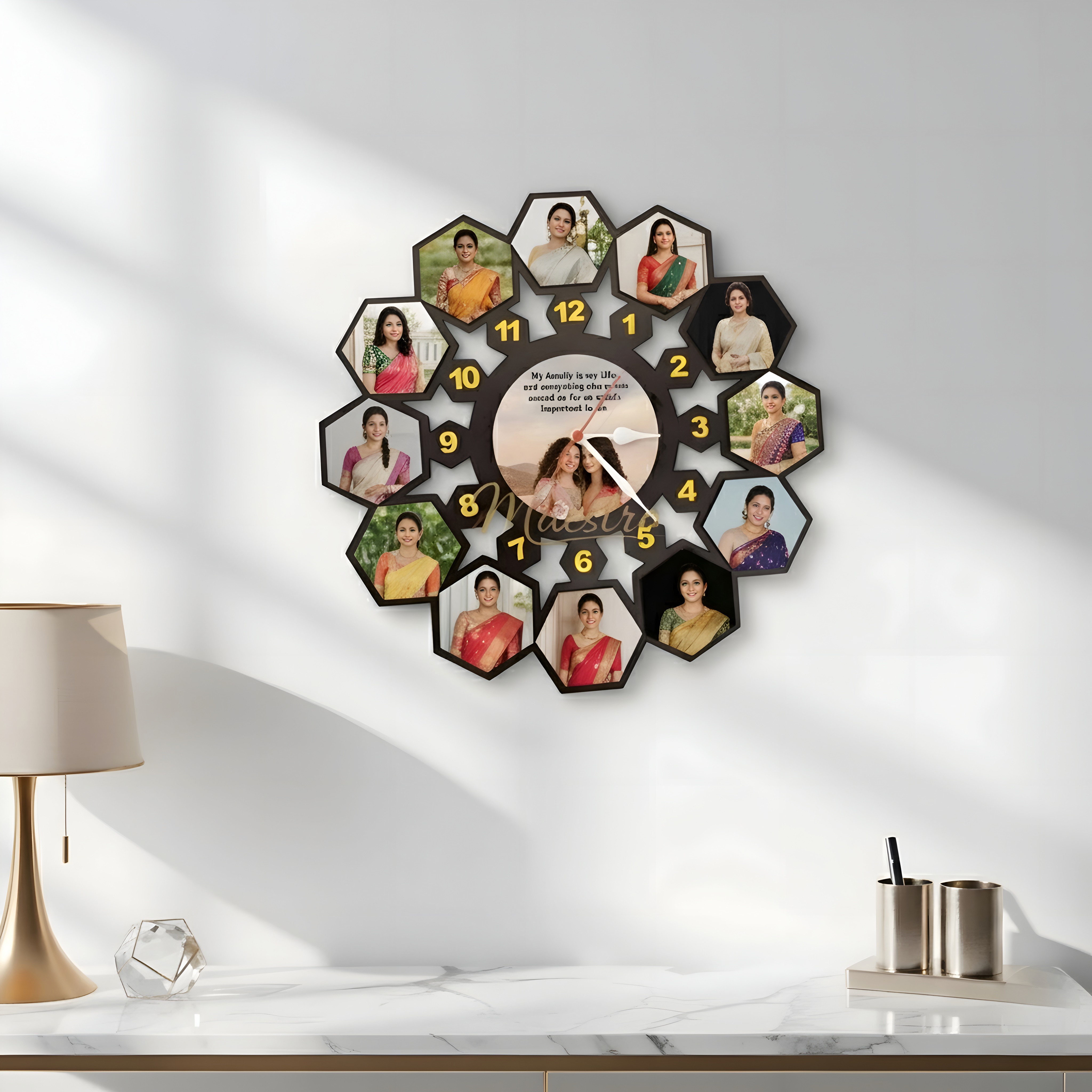 Stylish hexagon shaped MDF wall clock collage with 13 personalized photo slots perfect for family memories and gifting
