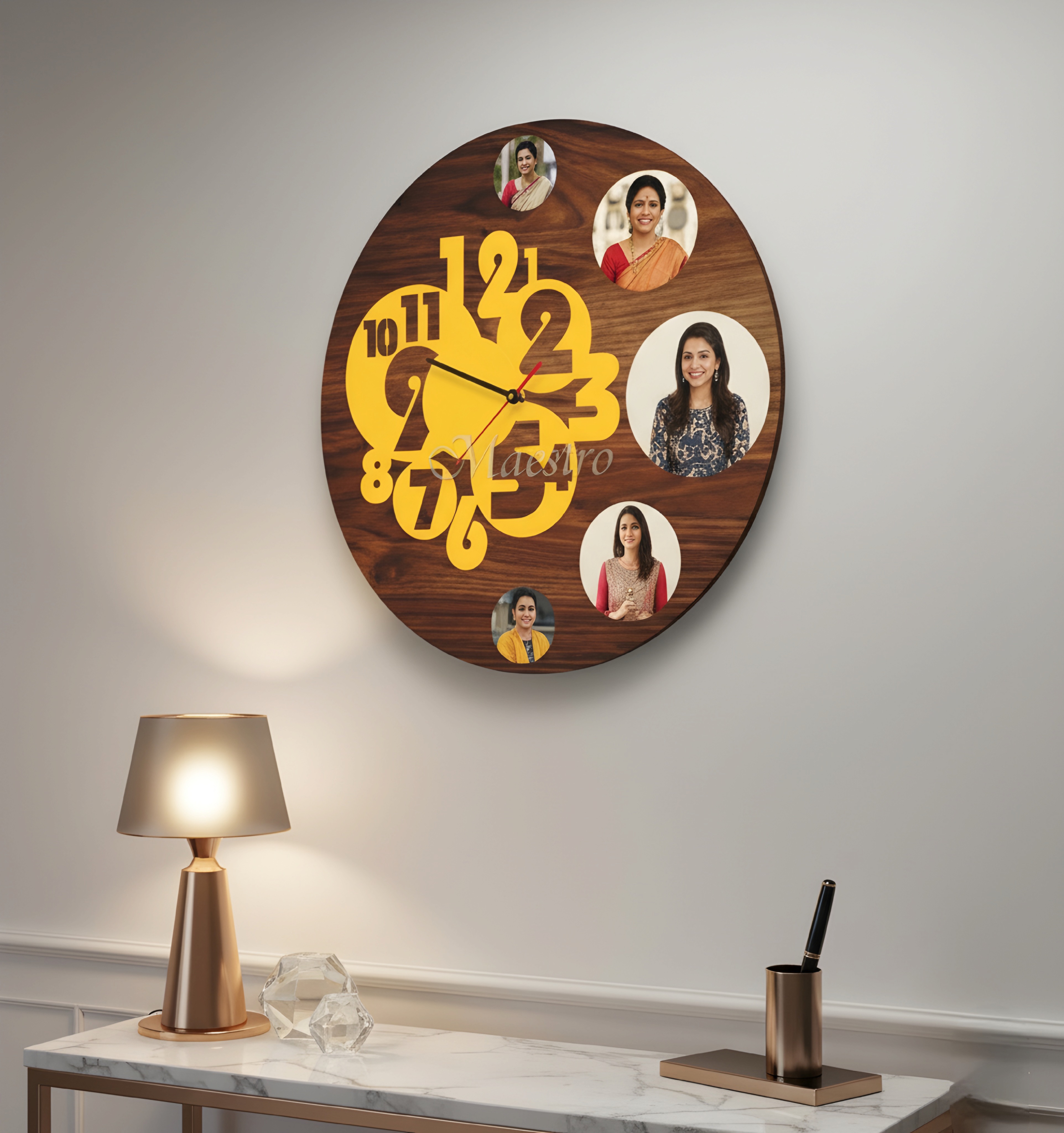 Stylish round MDF wall clock collage with 5 personalized photo slots designed for gifting and modern home decor