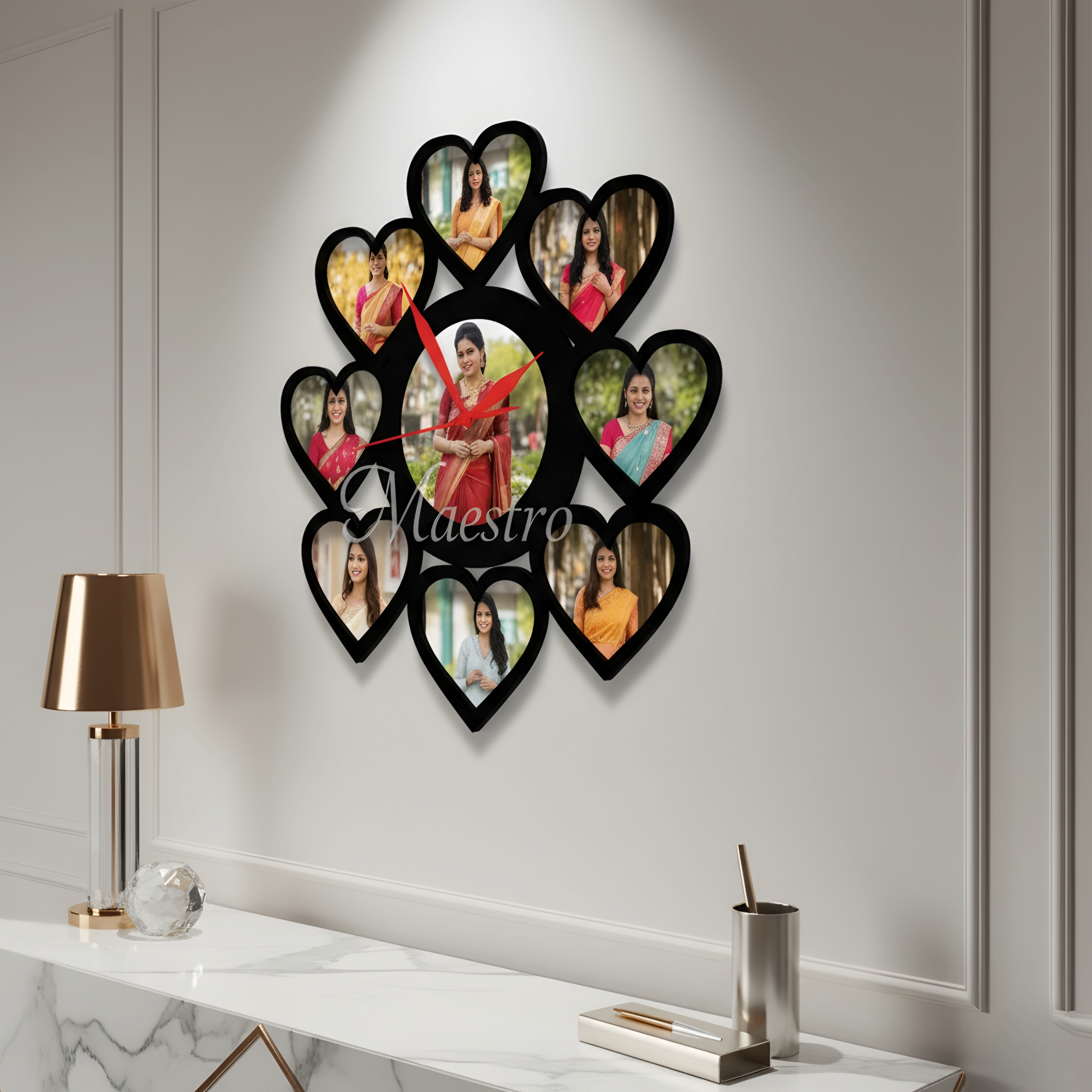 Romantic heart shaped MDF wall clock collage with 9 personalized photos perfect for couples and elegant home decor