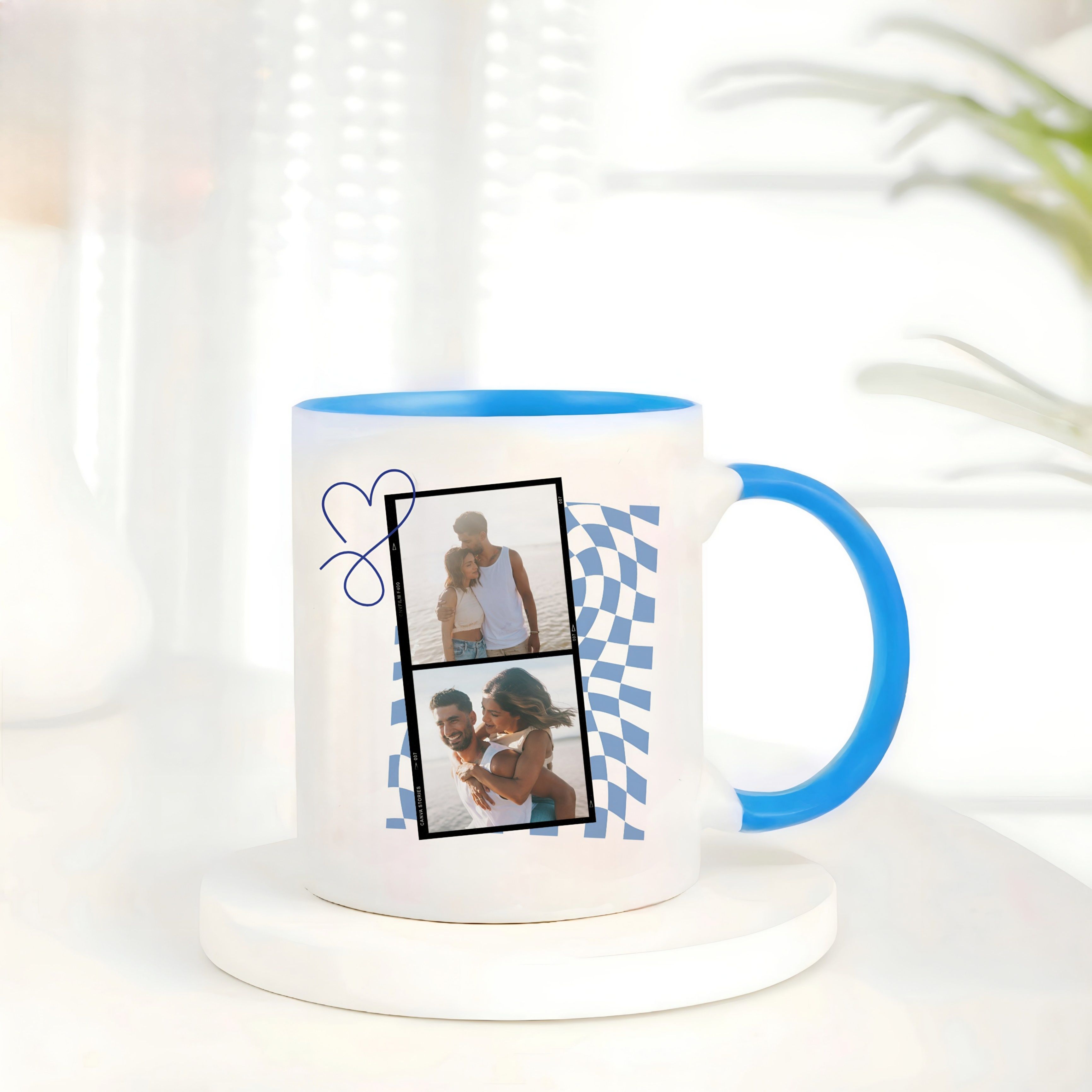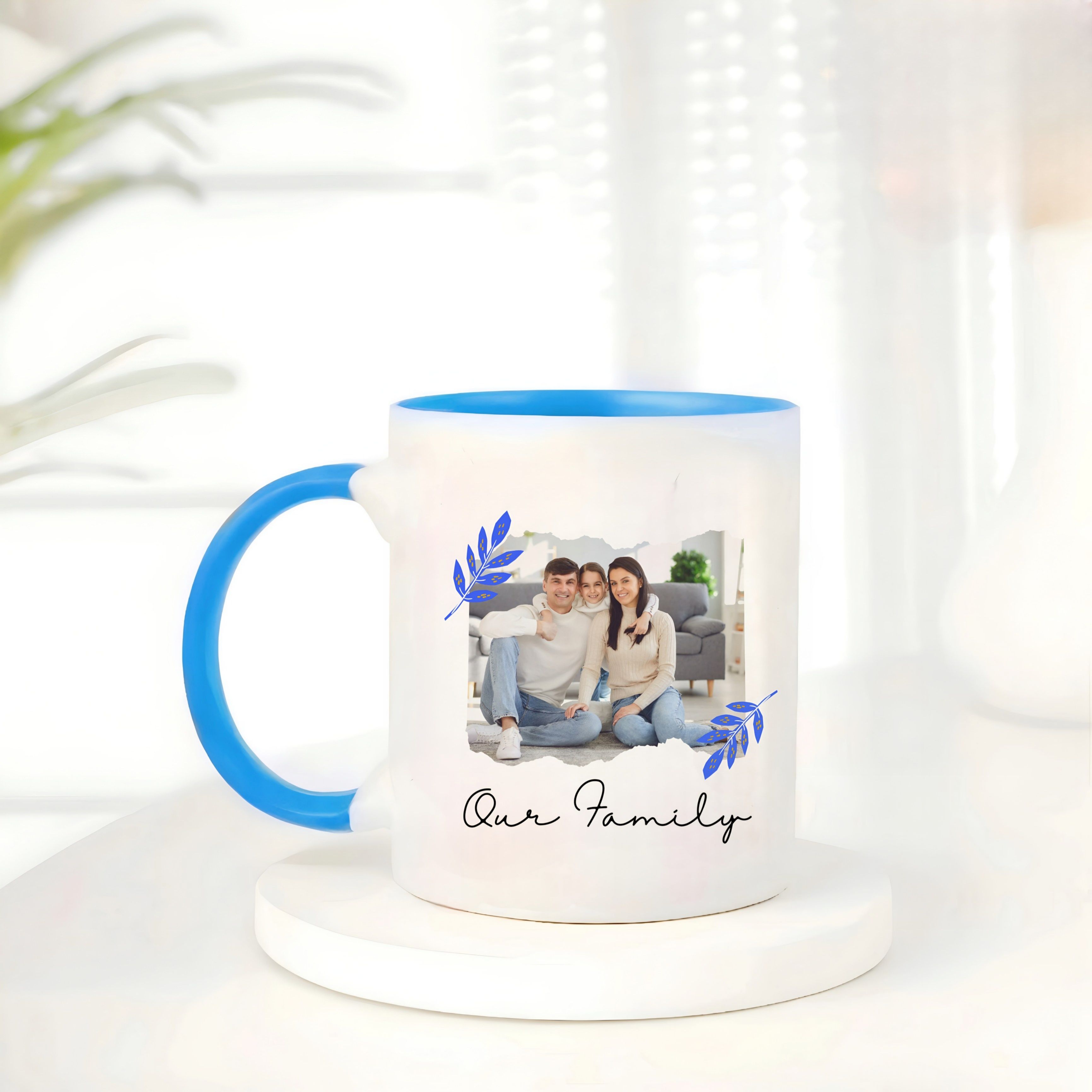 This blue-handle personalized mug is a keepsake of shared joy and family bonding. With vibrant photo prints and a stylish blue inner finish, it turns everyday tea or coffee moments into celebrations of love and connection.