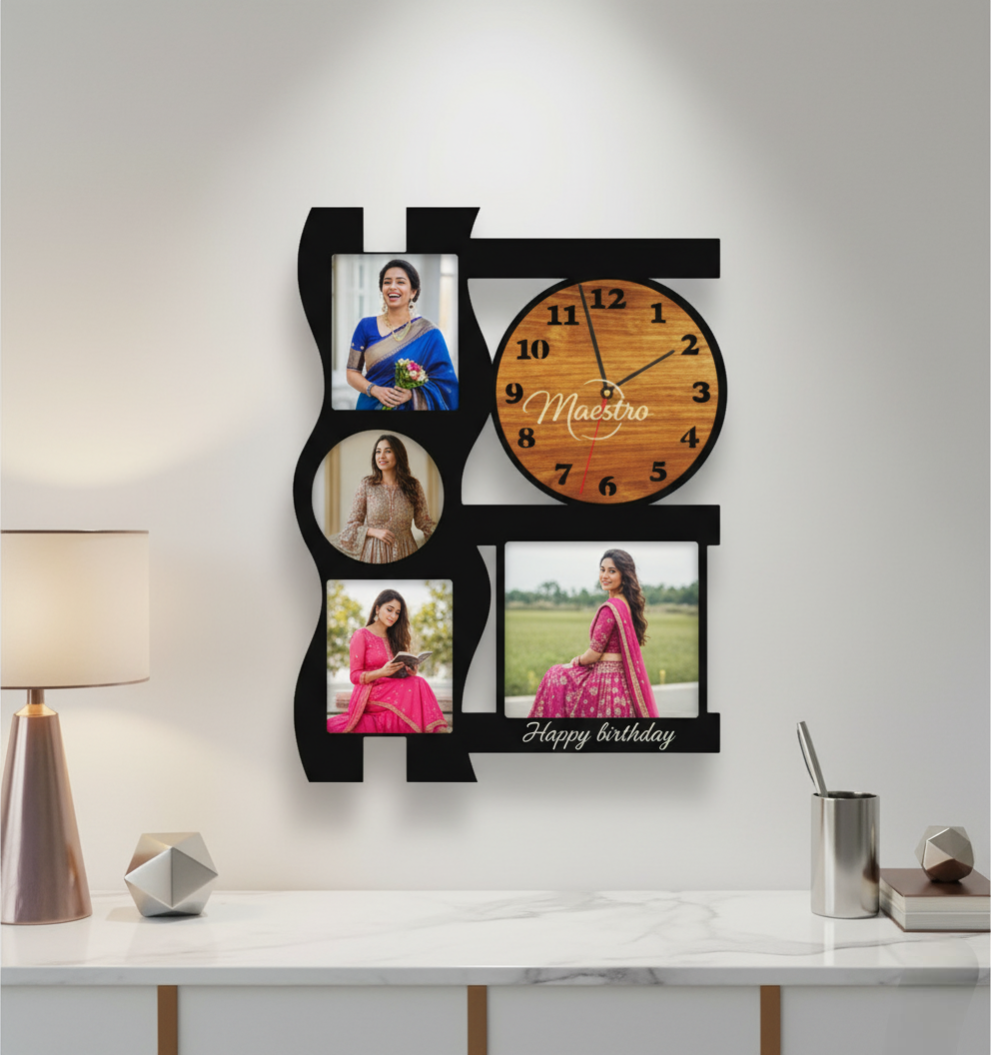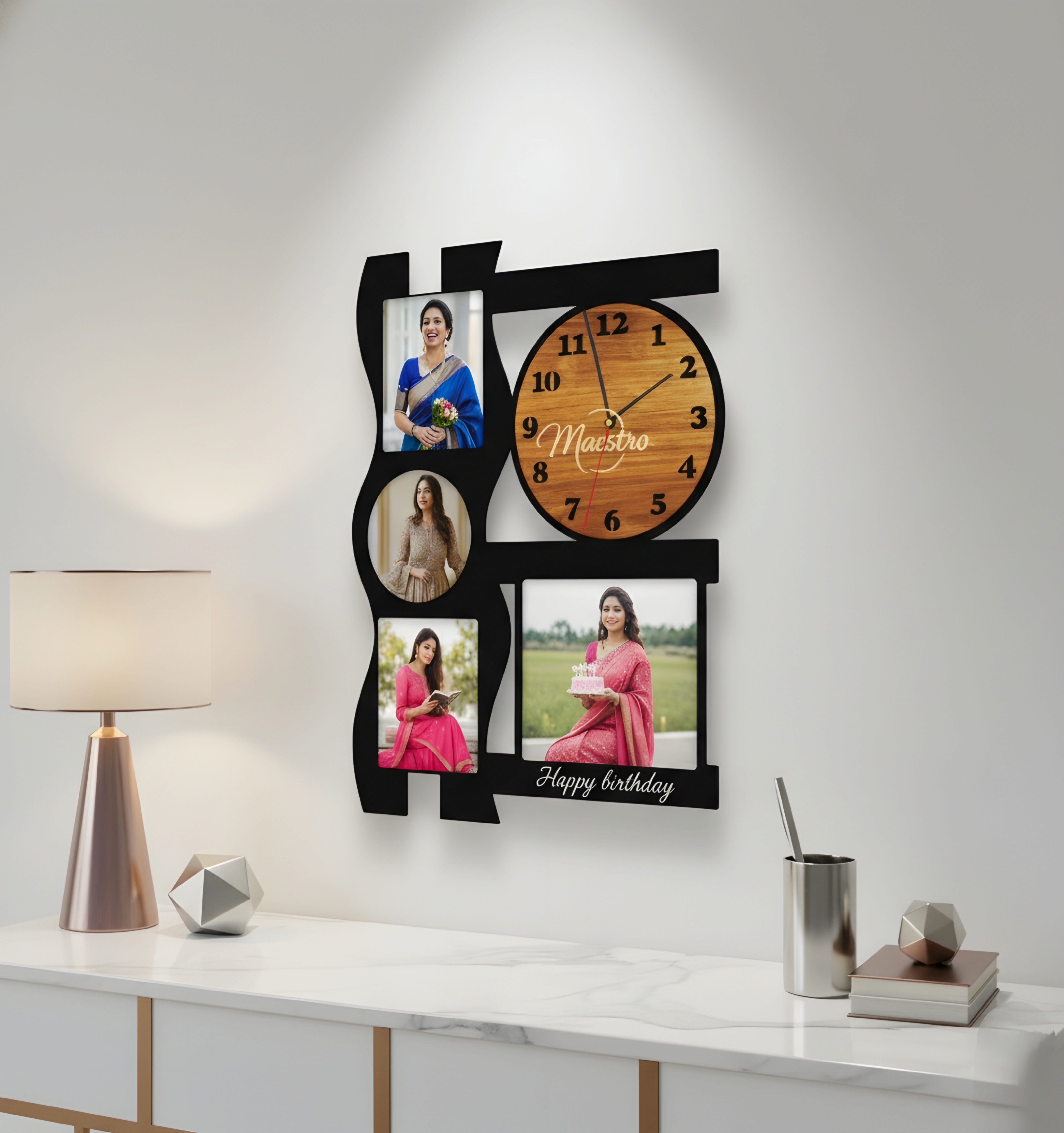 Stylish MDF wall collage with built in clock perfect for displaying your favorite 4 photos and enhancing your room decor