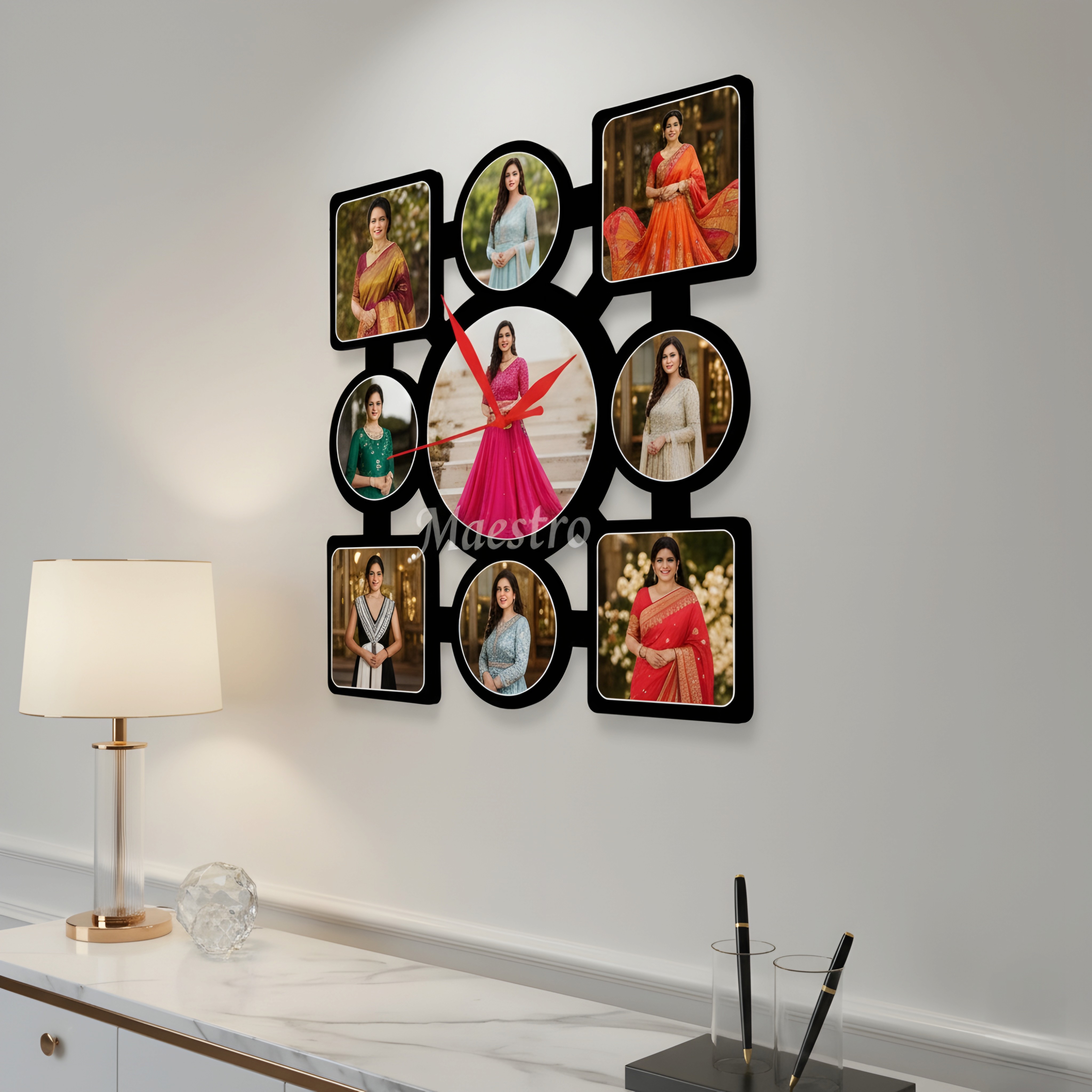 Beautiful 9 photo MDF wall collage with clock centerpiece perfect for personalizing your favorite memories and adding style to your home decor