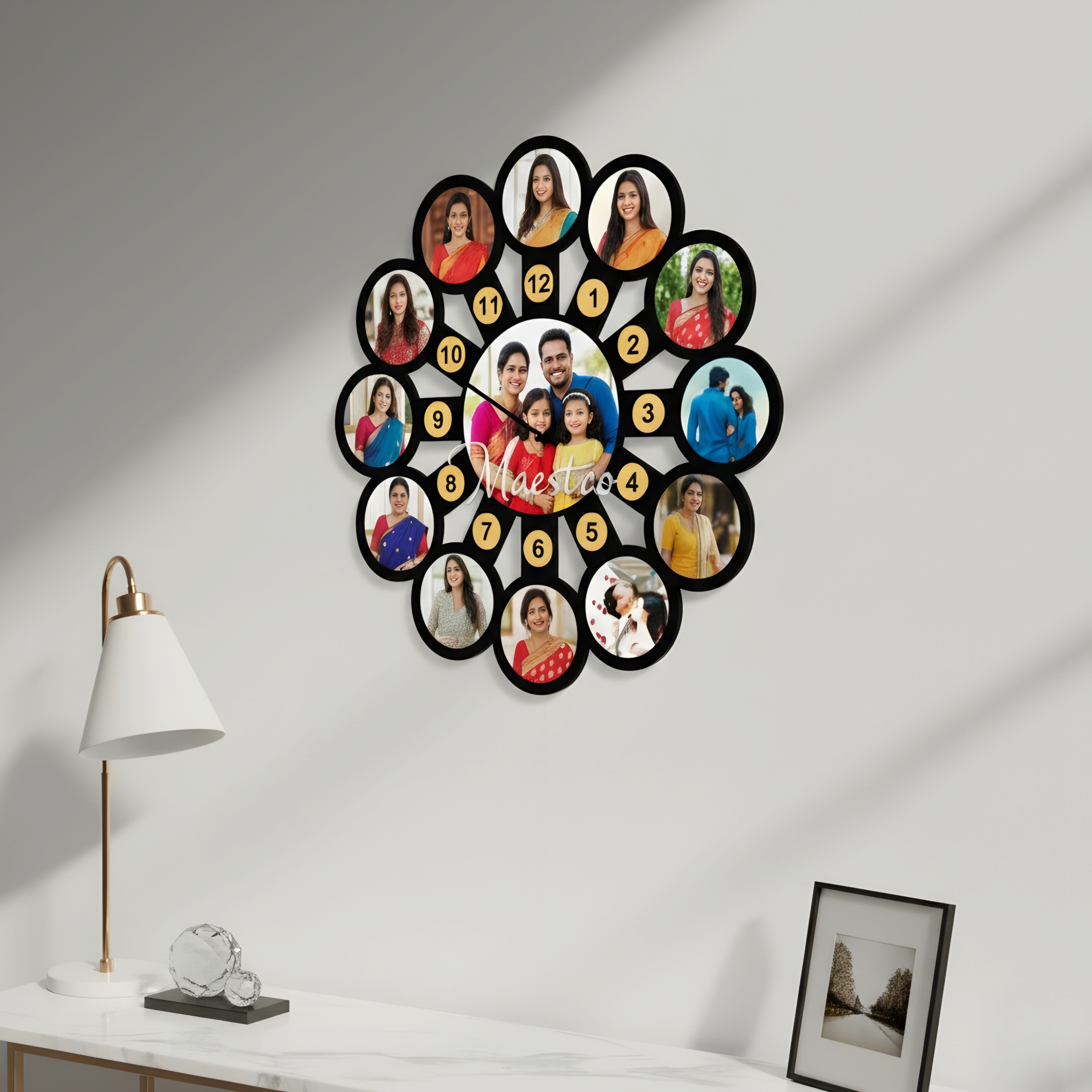 Beautiful circular MDF wall clock collage with 13 photo slots designed to display your special memories in a stylish way