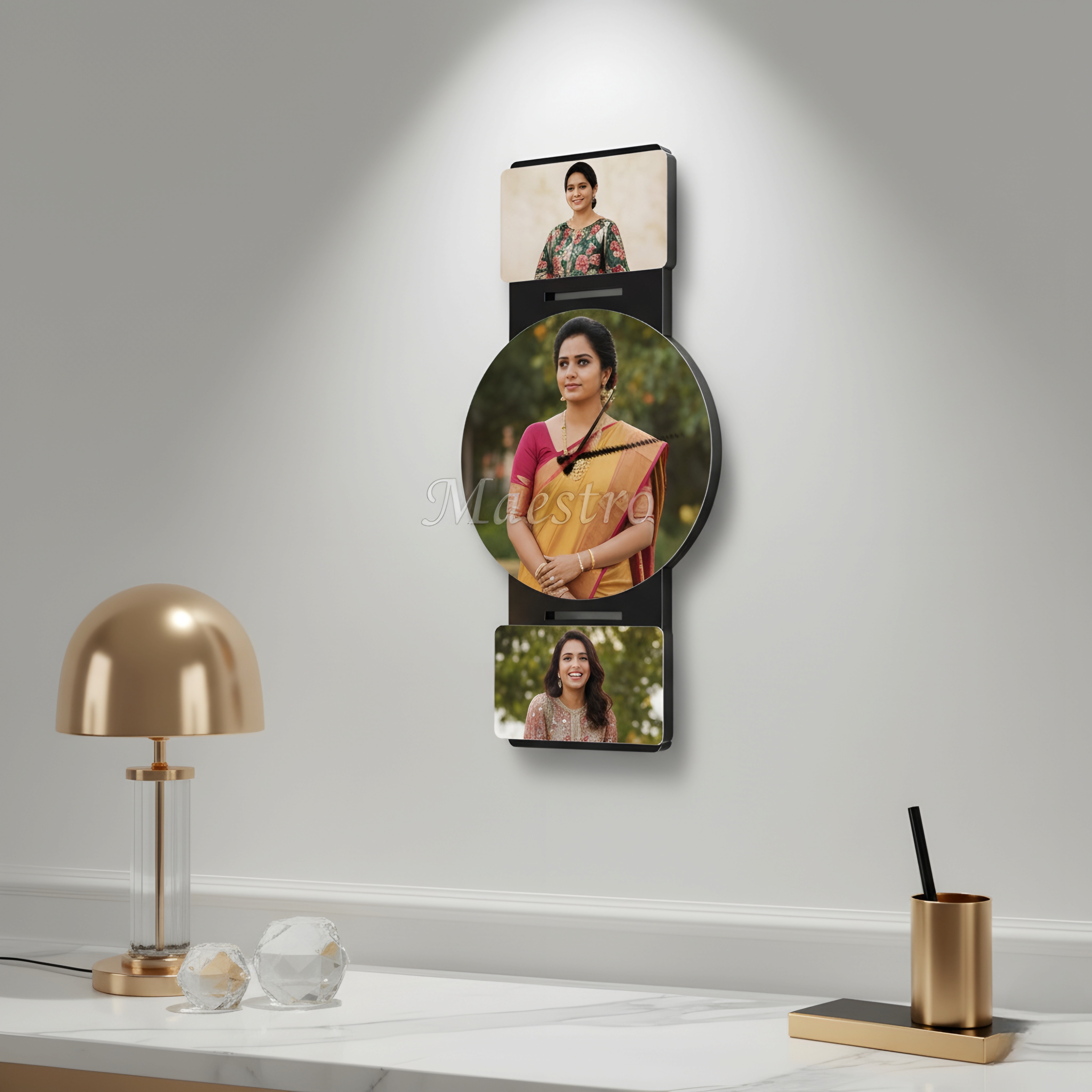 Elegant vertical MDF wall clock collage with 3 personalized photos perfect for gifting and home decoration