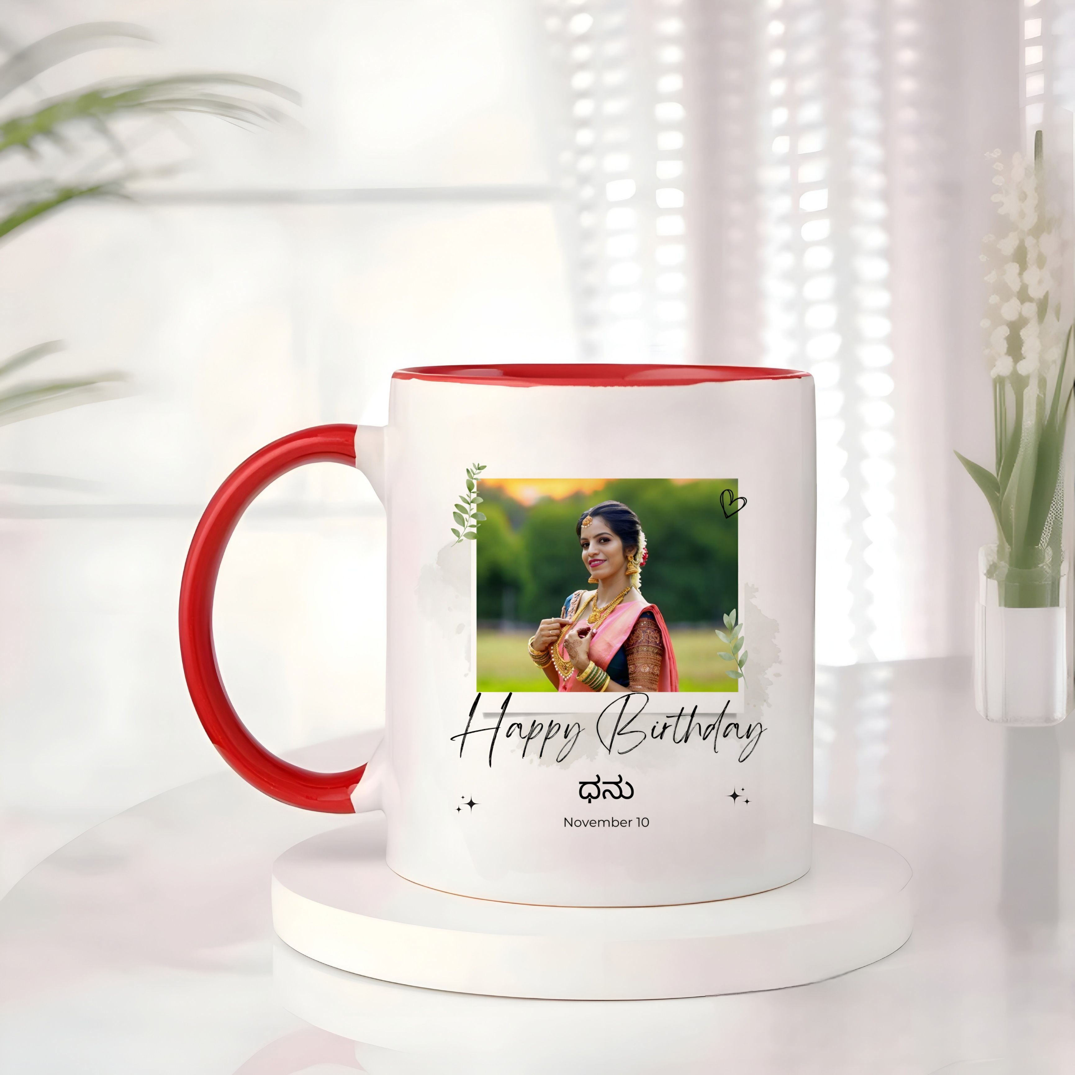 Celebrate your special day with a sip of warmth. This red-handle birthday mug keeps memories alive with your photo and name beautifully framed.